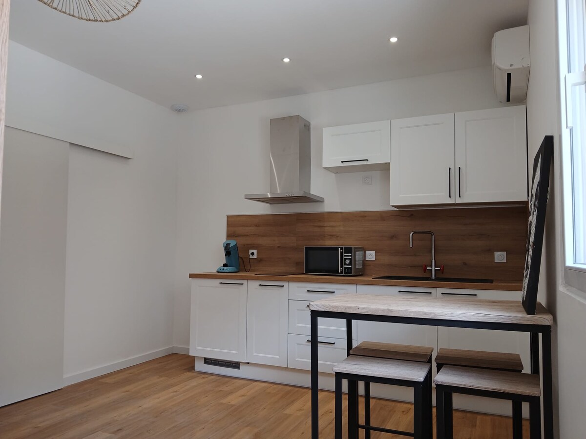 Appartement à l'étage d'une maison. Situé dans un petit village des Dombes en face d'un restaurant. Pièce principale avec cuisine intégrée et tout l'équipement qu'il faut, lave vaisselle, four, frigo, micro ondes... 1 chambre avec un lit en 140cm. Coin salon avec canapé et TV. Salle de douche avec une grande douche de 120cm et machine a laver. Chauffage et climatisation réversible. Terrasse donnant sur le jardin. Parking privé.
