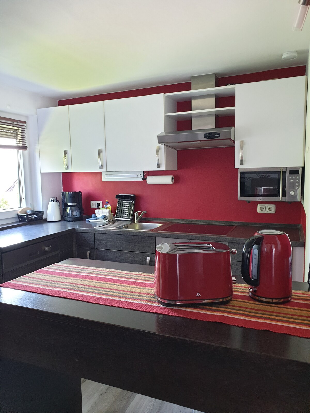Mieszkanie znajduje się na parterze i składa się z przedpokoju, salonu z piecem kominkowym i rozkładaną sofą, która może być również rozłożona jako podwójne łóżko, sypialni z podwójnym łóżkiem, które można również rozłożyć pojedynczo, kuchni i łazienki. Mieszkanie jest w pełni umeblowane i wyposażone. Wi-Fi, TV dostępne. Spokojna lokalizacja na skraju lasu, Passau i Vilshofen nad Dunajem oddalone o około 20 km. Dostępne miejsca parkingowe. Odpowiednie dla monterów, przedstawicieli handlowych i osób na krótkim urlopie. Oferujemy niedrogi transfer do Pullmanncity 10 km