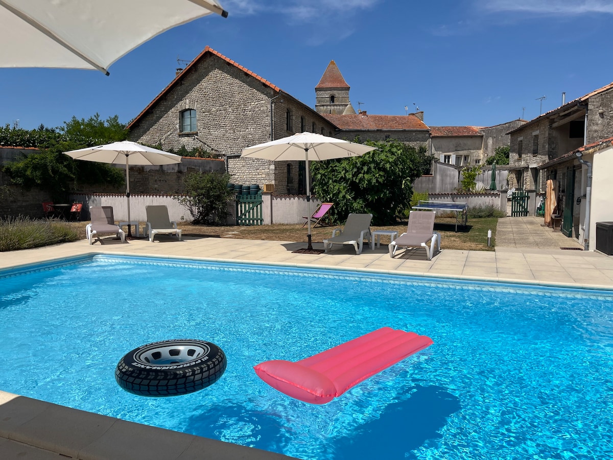 Profitez en famille de ce fabuleux logement à la campagne et ainsi découvrir notre beau département. À 45 min de La Rochelle, 45 min du marais poitevin, 1h de Poitiers et 1h30 des plages de Royan. Il se compose de 3 chambres ( 2 avec lit double et 1 avec lit superposés) possibilité de transformer le canapé en lit! Ce beau logement est totalement équipé. Il se compose également d’une piscine extérieure, d’un terrain de pétanque et d’un baby-foot.