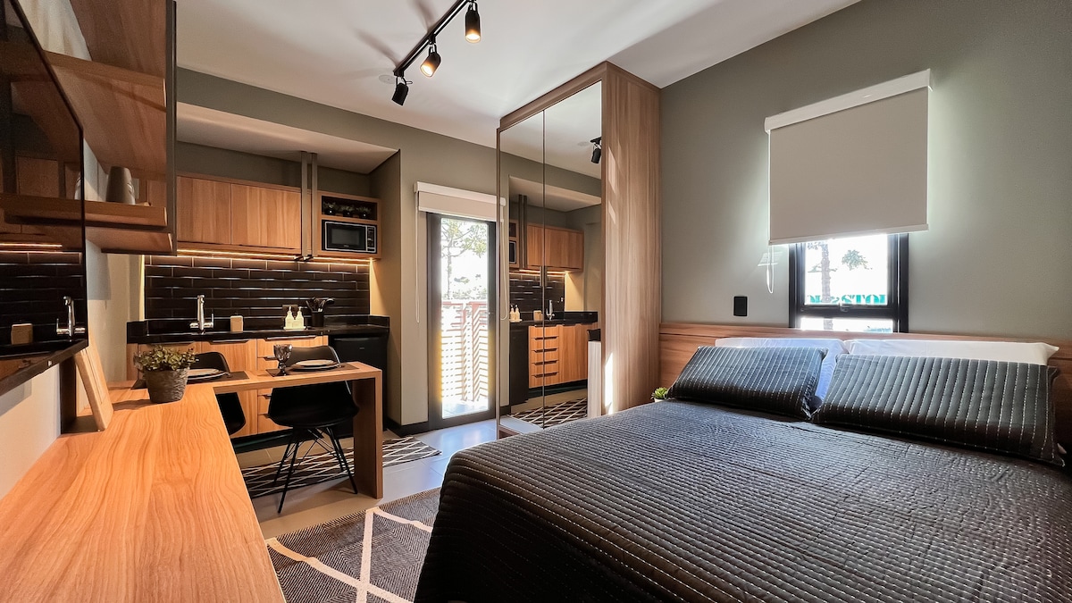 Um studio pra chamar de seu, totalmente equipado e decorado para hospedar grupos de até 4 pessoas. Você pode esperar por um espaço limpo, arejado, camas confortáveis, roupas de cama e banho de qualidade - tudo preparado para uma estadia de curta-média duração. A localização é imbatível, apesar de estar a menos de 10 minutos de carro do centro de Curitiba, a acomodação fica em bairro calmo, atrás do Bosque do Papa (40m) e pertinho do Museu Oscar Niemeyer (5 min andando).