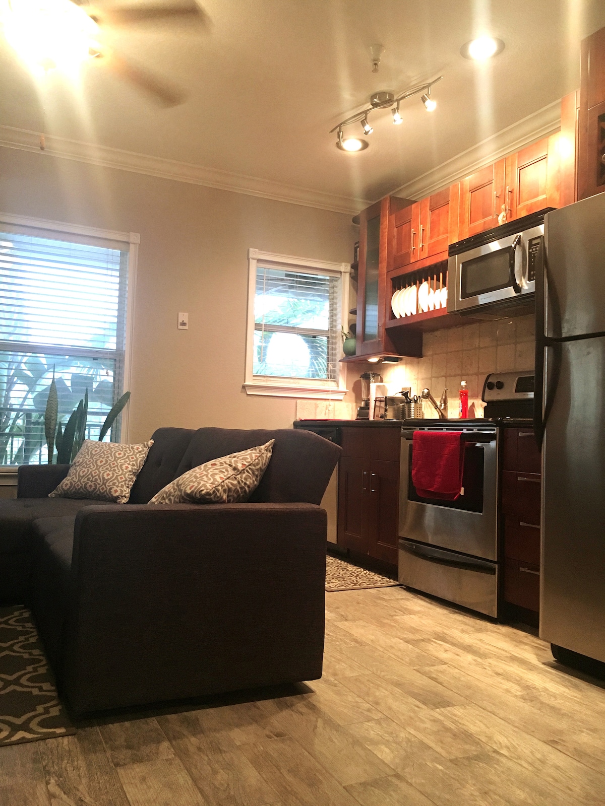Ta nowo wybudowana powozownia została zbudowana, aby uchwycić charakter i urok głównego domu, rzemieślniczego bungalowu z 1928 roku. Apartament z 1 sypialnią na drugim piętrze jest dobrze wyposażony w pełną kuchnię szefa kuchni, salon z rozkładaną sofą oraz pralkę/suszarkę. Wypij poranną filiżankę kawy lub kieliszek wina wieczorem na dużym ganku. 2 minuty spacerem do restauracji Grand Central, kawiarni, butików lub weź rower lub skuter na 5 minut jazdy do centrum St. Pete lub 15 do plaż.