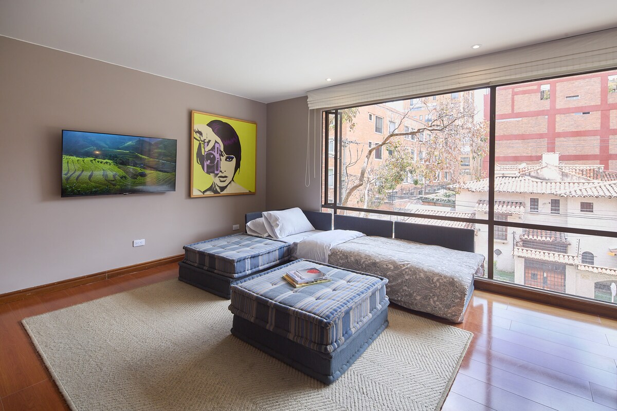 Ciesz się tą stylową i przytulną przestrzenią. Znajduje się w pobliżu różowej dzielnicy Bogoty, kilka minut drogi od najlepszych restauracji, barów i klubów nocnych w mieście. Z łatwym dostępem i najlepszymi udogodnieniami. Zarezerwuj teraz! I ciesz się najlepszą stolicą. W niektórych miejscach obowiązują dodatkowe opłaty ustalane bezpośrednio przez zarząd budynku. • Basen: 50 000 USD 2 godziny • Jacuzzi: 50 000 USD za godzinę • Sauna: 50 000 USD za godzinę