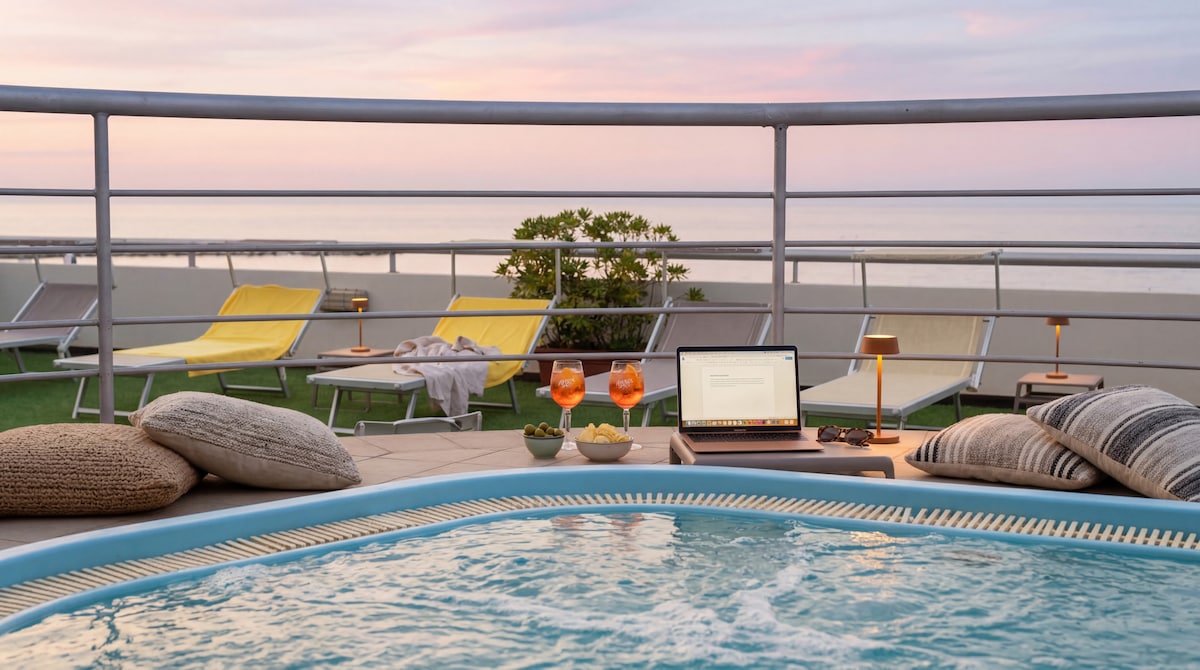 Twoja inteligentna baza w Riccione! 🌊 Pokój dwuosobowy 100 m od morza z prywatnym balkonem z widokiem na tył dla maksymalnego spokoju. Wyposażony w telewizor LED, szybkie Wi-Fi, elektryczne okiennice i bezpłatny minibar. ⚠️ Uwaga: pełna łazienka z bidetem i kabina prysznicową (bez okna lub z oknem, w zależności od dostępności). Bardzo mała winda w stylu vintage ↕️. Nasz plus? 🍳 Strefa gastronomiczna: wspólna kuchnia na antresoli. ☕ Kawa: 0,50 EUR! 🥐 Brunch: 10 euro (180 m). Otwieranie drzwi smartfonem 📲 i całodobowa recepcja. 🚀
