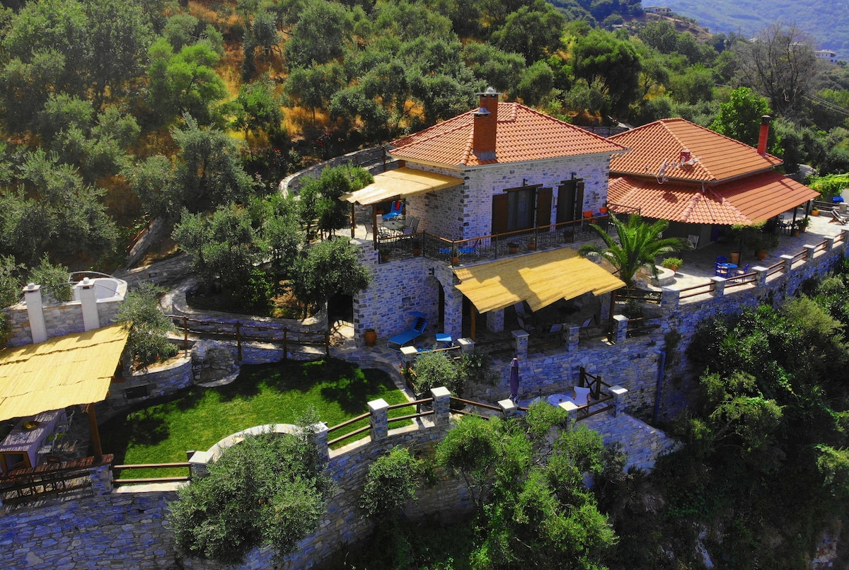 Górska chata została zbudowana w 1928 roku z lokalnym kamieniem z Pelion, ma specjalny projekt architektoniczny i została niedawno całkowicie odnowiona (2016). Widok jest imponujący, a wnętrze domu szczyci się romansem innej epoki ze wszystkimi nowoczesnymi udogodnieniami. Nieruchomość ma dwa piętra i ogród (1000 m2).