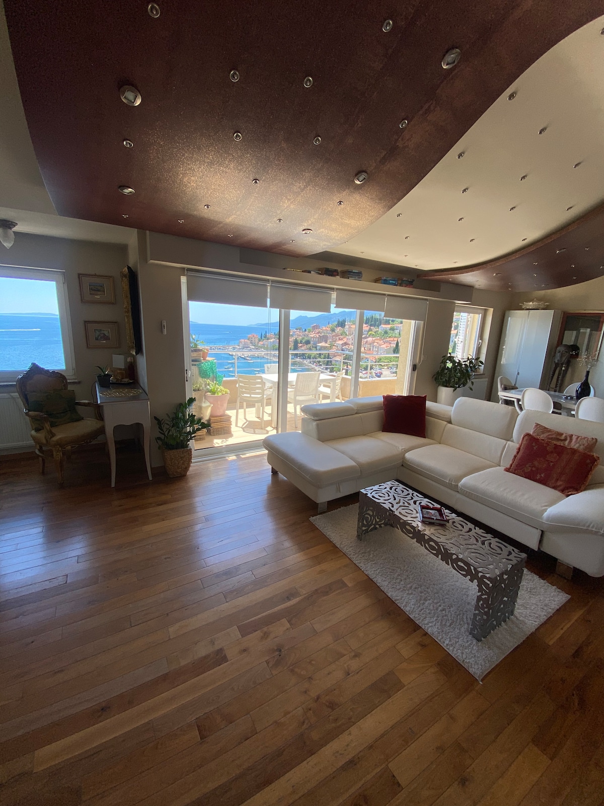 Świeżo odnowiony apartament w 117 letniej austro-węgierskiej willi, kilka metrów od morza, tuż nad piękną przystanią jachtową i promenadą Franza Józefa I, kilka minut spacerem od historycznego centrum starej arystokracji letniskowej miasta Opatija. Z balkonu o powierzchni 14 metrów kwadratowych można podziwiać słoneczny widok na zatokę Kvarner, okoliczne zabytkowe wille, zielony ogród lub spędzić relaksujący wieczór z ulubionym napojem, podczas gdy światła miasta odbijają się od Morza Adriatyckiego.