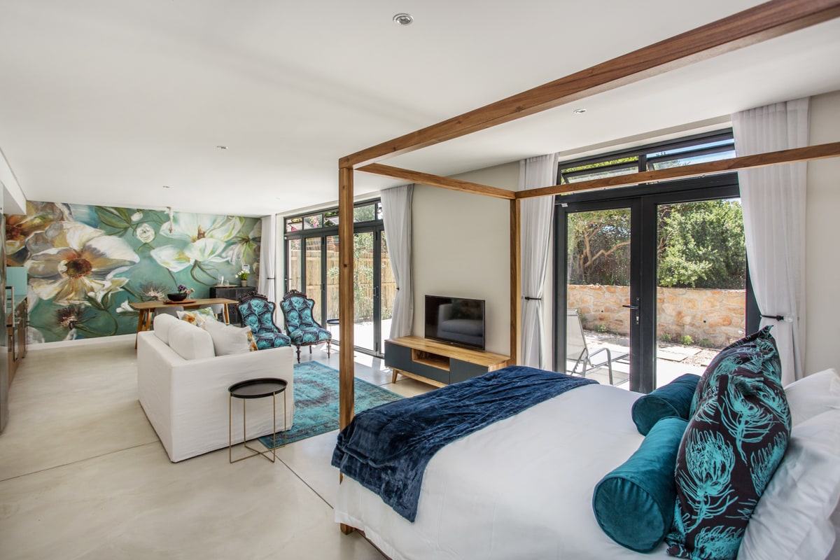 Nasz apartament typu studio otwiera się na 40-metrowy balkon z panoramicznym widokiem na dolinę Hout Bay i góry Helderberg. Duże przesuwne drzwi znikają w ścianach, tworząc niezakłócony przepływ wewnątrz/na zewnątrz, a podwyższona pozycja chroni Twoją prywatność. Łazienka na planie otwartym wychodzi na zamknięty tajemniczy ogród, w którym znajduje się bezramowy szklany prysznic. Lokal posiada w pełni wyposażony aneks kuchenny i jest serwisowany codziennie z wyjątkiem weekendów i świąt.