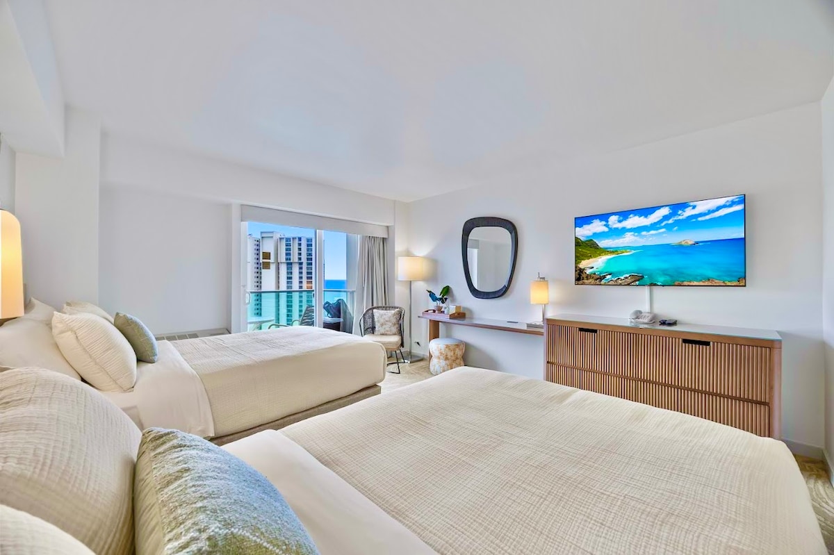 Nowo odnowiona sypialnia w Waikiki Banyan z czystymi i nowoczesnymi akcentami. Apartament na 26 piętrze ma 533 stopy kwadratowe, może pomieścić 4 osoby dorosłe. Kilka kroków od plaży z pięknym widokiem na ocean z własnego balkonu. W sypialni znajduje się łóżko typu king size z pianki memory foam, a w salonie rozkładana sofa typu queen size. Jednostka posiada w pełni wyposażoną kuchnię, Wi-Fi, klimatyzację, wyposażenie plażowe i BEZPŁATNY PARKING na miejscu. W budynku znajduje się grill, basen, jacuzzi, sauna, plac zabaw dla dzieci, pralki i całodobowa ochrona.