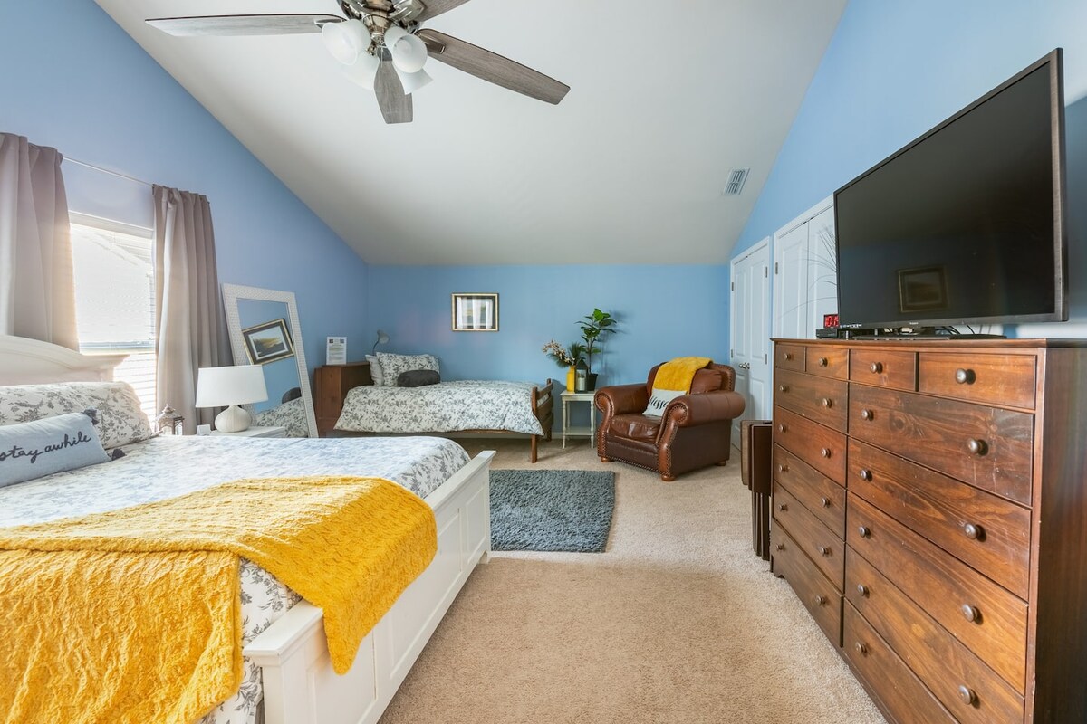 Zafunduj sobie odpoczynek i wyciszenie w tym wyjątkowym miejscu o powierzchni 2850 stóp kwadratowych, wystarczającej dla całej rodziny/przyjaciół. Wypij kawę w wannie z hydromasażem na tarasie, zafunduj sobie masaż w fantastycznym fotelu do masażu. Zrelaksuj się w barze BYOB, gdzie możesz oglądać mecz lub śpiewać karaoke. Albo usiądź przy ognisku. Główna sypialnia wyposażona jest w regulowane łóżko typu king, pokój gościnny w łóżko typu queen, a w pokoju gościnnym 2, pokoju dodatkowym, pokoju słonecznym i salonie znajdują się sofy.