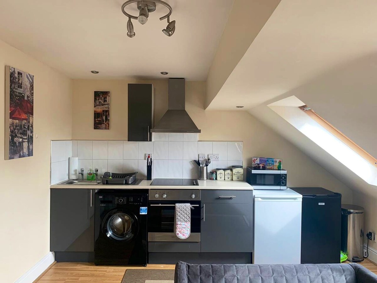 Przytulny prywatny loft z 1 sypialnią i kuchnią.