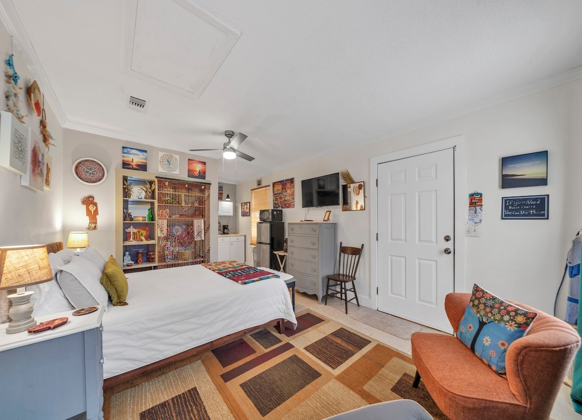 Short walk to beach and Gulf. Adorable designer studio w/ private entrance on back side of main cottage which is also rented. 2 Guest Maximum. Marble floors /10’ ceilings! Fully stocked kitchen, Studio is tiny but a great beach bargain. See photos. Queen bed & 4' love seat. Enough room to relax after the beach. Large deck with umbrella in backyard . Walk to beach with parking on property. For Main House Rental: https://www.airbnb.com/hosting/listings/editor/44459884/view-your-space