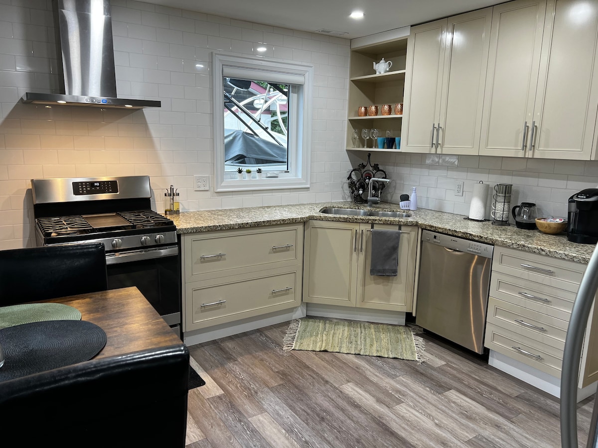 Witamy w naszym uroczym apartamencie na parterze w pięknym mieście Orillia! Ta przestrzeń jest odpowiednia dla rodzin lub małych grup szukających komfortowego pobytu w dogodnej lokalizacji. Jest to w pełni umeblowany dom, który posiada trzy sypialnie, jedną łazienkę, w pełni wyposażoną kuchnię ze wszystkimi niezbędnymi udogodnieniami potrzebnymi do przygotowania własnych posiłków. Salon jest jasny i przytulny, wyposażony w 43-calowy telewizor Samsung Smart TV z Netflix, nieograniczony szybki internet i przestronny 6-osobowy stół jadalny.