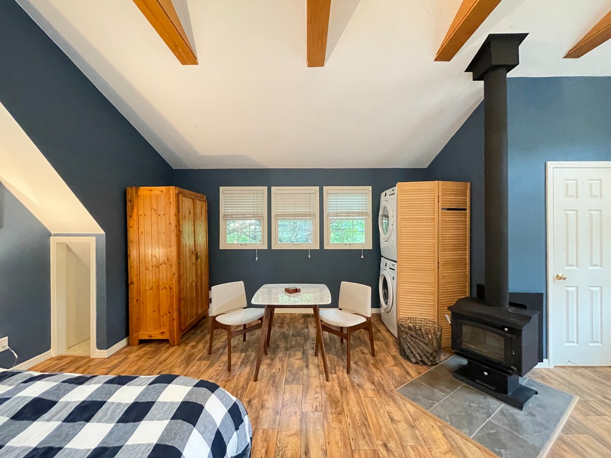 Świetny wypoczynek w pięknie utrzymanej i odnowionej oryginalnej chacie z bali osadników wypełnionej książkami poezji i sztuki, słoneczny pokój z huśtawkami na ganku do klasycznej zabawy osadników, pełna kuchnia i wanna z pazurami, sypialnia z pełnowymiarowym łóżkiem, pięćdziesiąt akrów lasów do odkrycia i otwarte pole do obserwowania nieba. Idealne na samotny wypad lub romantyczną wycieczkę. Zwierzęta są mile widziane – poinformuj mnie o tym, abyśmy mogli odpowiednio zaplanować.
