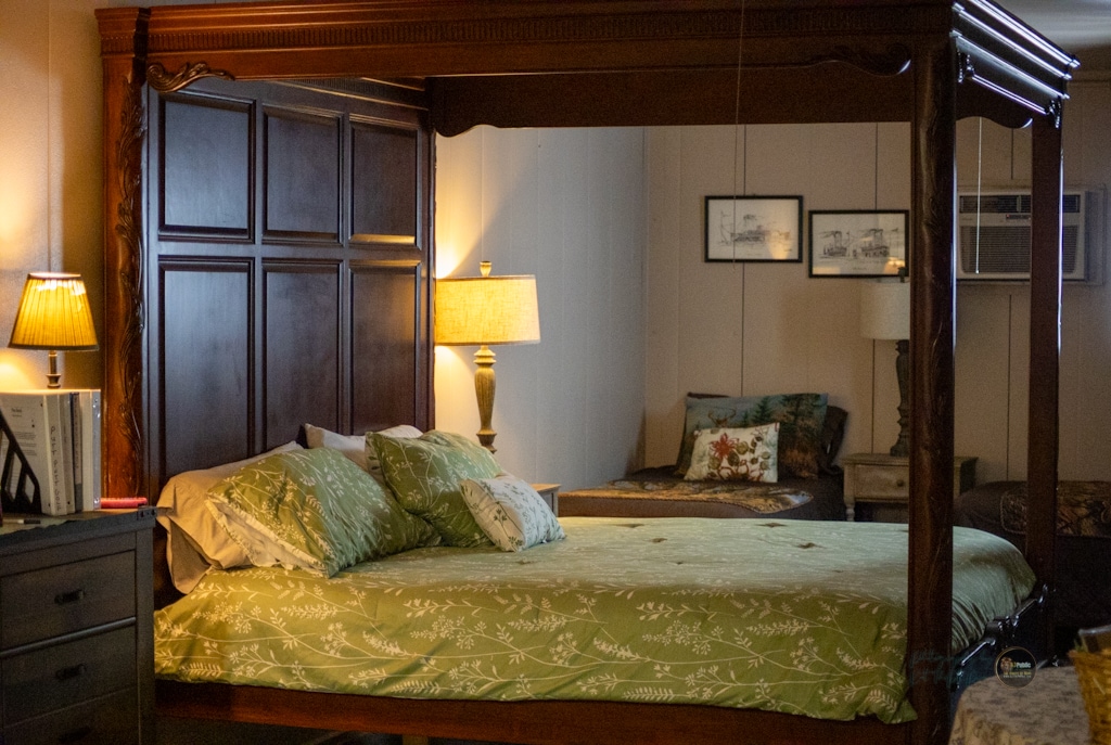Przestronny dwupokojowy apartament na drugim piętrze zależności z 1853 roku pierwotnie używany jako sala szkolna i prywatne kwatery guwernantki. Całkowicie odnowione w latach 2017-2018, z w pełni zaopatrzoną kuchnią, jadalnią i wygodną sofą do spania dla towarzyskich lub dodatkowych gości. Sypialnia ma łóżko typu Queen, część wypoczynkową i łazienkę z marmurową kabiną prysznicową. Wentylatory sufitowe w obu pokojach i na dużej prywatnej galerii – idealne na poranną kawę lub herbatę, słuchanie ptaków lub oglądanie świetlików wiosną i latem.