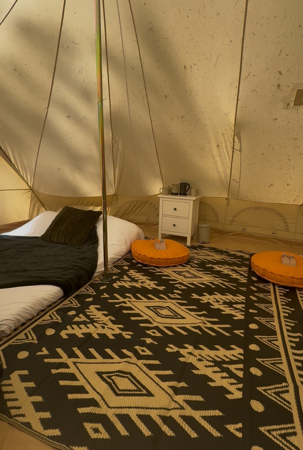 Dodaliśmy piękny namiot dzwonowy dla tych, którzy szukają prostego, minimalistycznego kempingu – bez potrzeby używania sprzętu. Po prostu przyjedź i ciesz się wieczorem pod gwiazdami z paleniskiem, lampkami i naturą dookoła. Jest tu łóżko z ramą i materacem z pianki termoplastycznej, więc nie trzeba się tu ograniczać. Nie ma prysznica, ale masz własną toaletę. Spokojna, bezproblemowa noc pod namiotem – z odrobiną komfortu.
