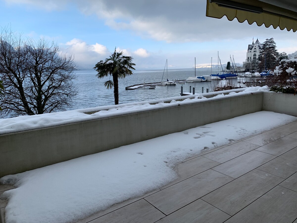 Beautiful location right by the marina. Enjoy a breathtaking view of Lake Lucerne and amazing sunsets from this completely remodelled luxury apartment by the lake, bedroom with two double glass doors with direct access to the large terrace from the bedroom and the living room, flat screen TV, Sonos sound-system, Bluetooth speaker, modern lighting system, high specification kitchen, big refrigerator, dishwasher, oven, steamer, electric shutters, under floor heater, free parking, elevator.