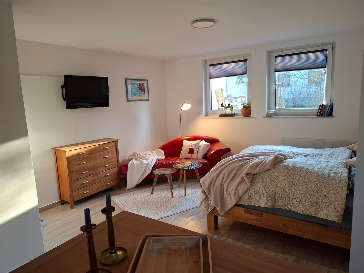 Piękne, bezbarierowe 2-pokojowe mieszkanie w ekologicznym drewnianym domu. Prywatny taras, położony na obrzeżach Gräfensteinberg między jeziorami Brombachsee i Altmühlsee, naprzeciwko „Drei Eichen”, z pięknymi widokami. Plac zabaw oddalony o zaledwie 200 m. Psy mile widziane. Do obu jezior można dotrzeć w ciągu 10–15 minut rowerem. W pełni wyposażona kuchnia. Lokalny sklep w wiosce w odległości spaceru. Sauna na świeżym powietrzu, 2 rowery elektryczne z przyczepą Thule Cab2 i ładowarka EV Wallbox dostępne za dodatkową opłatą.