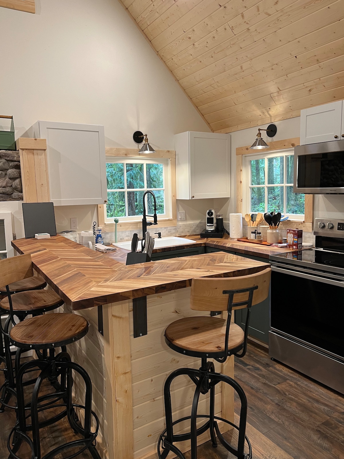Ta odnowiona chatka jest piękna! Jest wyjątkowy pod względem architektonicznym, z ciekawymi liniami, oknami od podłogi do sufitu, otwartą koncepcją głównego piętra, piecem opalanym drewnem i łóżkiem typu king size w lofcie. To świetna baza wypadowa do odkrywania wszystkich gór. Hood ma do zaoferowania i piękną przestrzeń do relaksu!