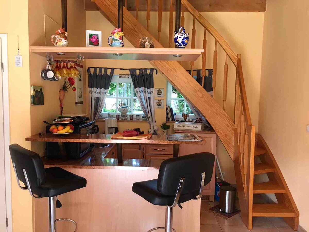 Małe mieszkanie w centrum Harsefeld (około 30 m²). Jest centralne, a jednocześnie ciche i ustronne, otoczone drzewami i pięknym ogrodem. Stodoła i domek z dachem krytym strzechą (gdzie mieszkają gospodarze) uzupełniają zespół budynków na terenie posesji. Parking dla gości na miejscu jest dostępny (i wliczony w cenę przy rezerwacji mieszkania). Ważne: część sypialna znajduje się na piętrze i można do niej dotrzeć tylko dość stromymi i wąskimi schodami – goście powinni czuć się komfortowo wspinając się na górę!