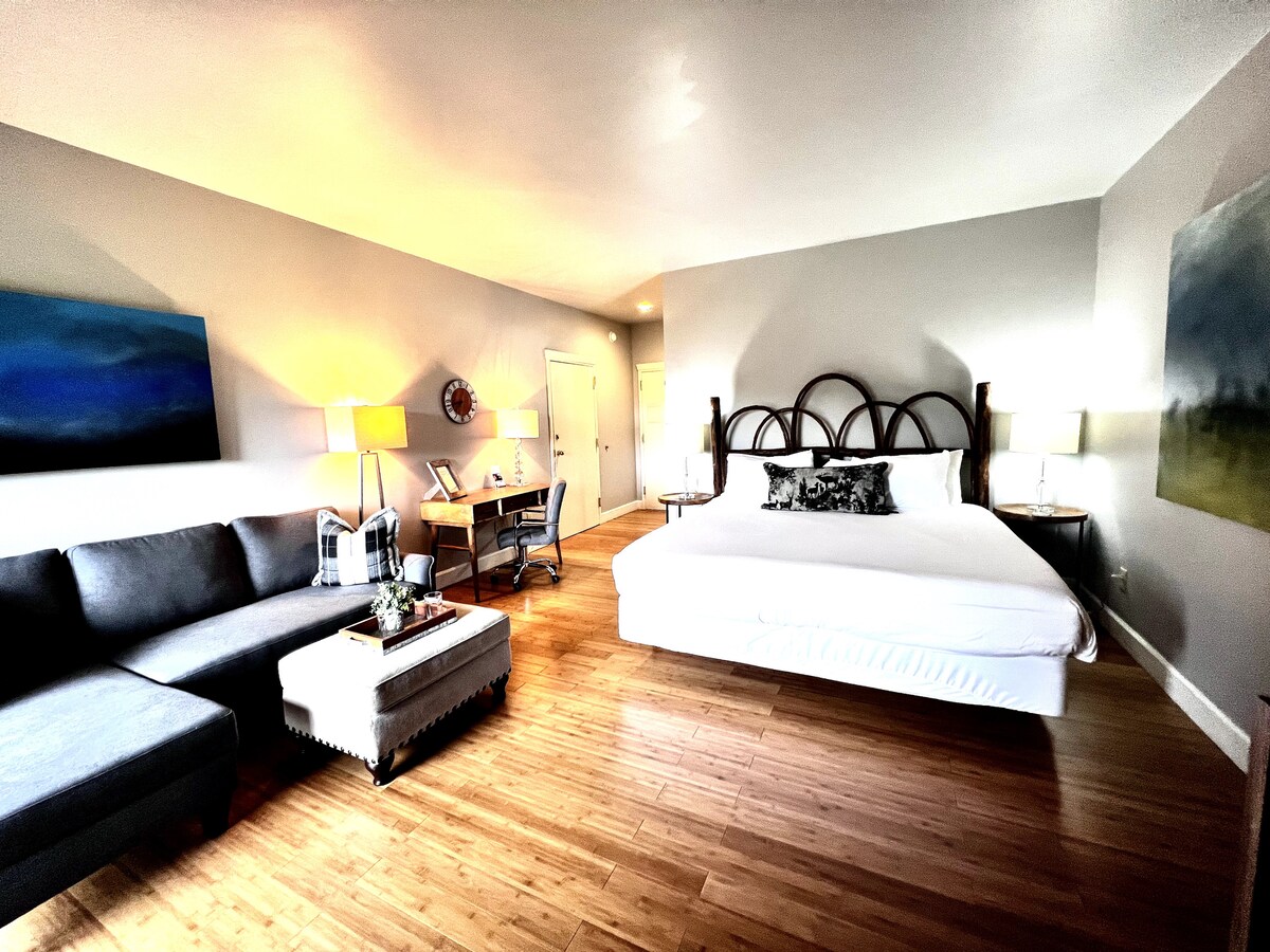Pokoje są odświeżane, więc mogą wyglądać inaczej niż na zdjęciach. Wystrój jest współczesny z elementami rustykalnego designu. Oświetlenie w całym pomieszczeniu zapewnia romantyczny nastrój, a z okien roztacza się widok na zmieniający się z dnia na dzień krajobraz. 1 łóżko typu King, 1 rozkładana sofa typu Queen, minilodówka, kuchenka mikrofalowa, ekspres do kawy, telewizor Smart TV, biurko, pełna łazienka, dodatkowa przestrzeń poza łazienką, pełnowymiarowy zlew, szuflady do przechowywania, przestronny ganek z widokiem na wiecznie zmieniające się liście.