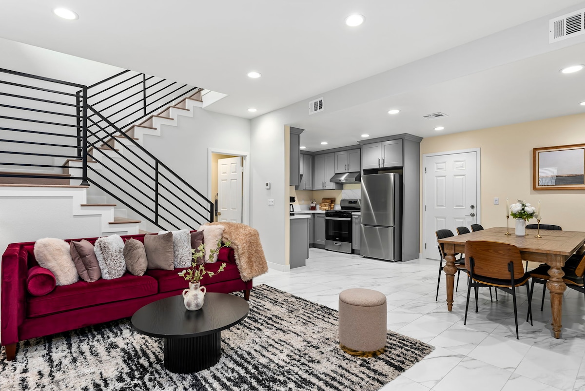 ✨ Weź ze sobą rodzinę! Poczuj się jak w domu w tym przestronnym domu z 4 sypialniami i 6 wygodnymi łóżkami, idealnym dla rodzin i przyjaciół. Otwarty, nowoczesny układ wnętrza jest wypełniony naturalnym światłem słonecznym dzięki świetlikom, a każdy szczegół został zaprojektowany tak, aby zapewnić przytulność i gościnność. 🌞🏡 Zrelaksuj się w salonie z ogromnym 65-calowym telewizorem, gotuj razem z innymi w w pełni zaopatrzonej kuchni lub zjedz posiłek na świeżym powietrzu przy stole dla 8 osób na tarasie. Dodatkowo możesz cieszyć się ścianą ze zdjęciami, która oddaje prawdziwy klimat Kalifornii! 🌴📸