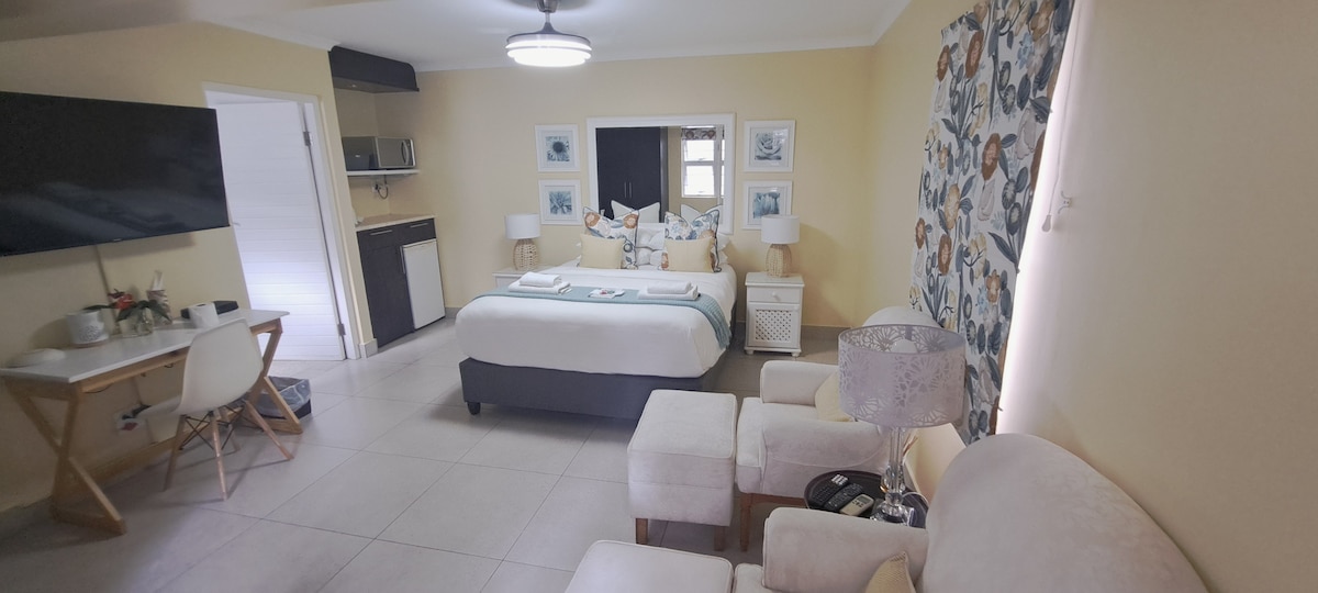 Aby powitać Cię w naszym świecie, nasz wystrój jest neutralny glam, w prywatnym i spokojnym otoczeniu w Cowies Hill z dużym tarasem z widokiem na rezerwat przyrody. Wyposażenie: klimatyzacja z grzejnikiem, duży telewizor z pełnym pakietem DSTV, Wi-Fi bez ograniczeń 40 meg, korzystanie z basenu i przestrzeni do pracy. Kuchnia z własnym wyżywieniem wyposażona jest w lodówkę, kuchenkę mikrofalową, ekspres do kawy, czajnik, toster, frytkownicę, indukcyjną płytę kuchenną oraz wszystkie naczynia i sztućce. Sypialnia posiada wygodne podwójne łóżko i szafę.