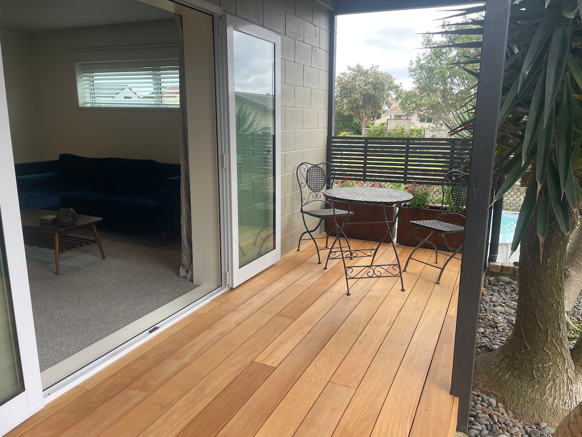 Witaj w mojej zacisznej kryjówce. Studio to duża przestrzeń na planie otwartym. Duże przesuwne drzwi całkowicie otwierają front budynku na taras, dając poczucie bliskości natury. Otoczone drzewami, sadem, trawnikiem i ogrodem studio jest spokojnym miejscem na wypoczynek. W tle słychać szum morza i śpiew ptaków. Najlepsza plaża w Nowej Zelandii znajduje się 15 minut spacerem!