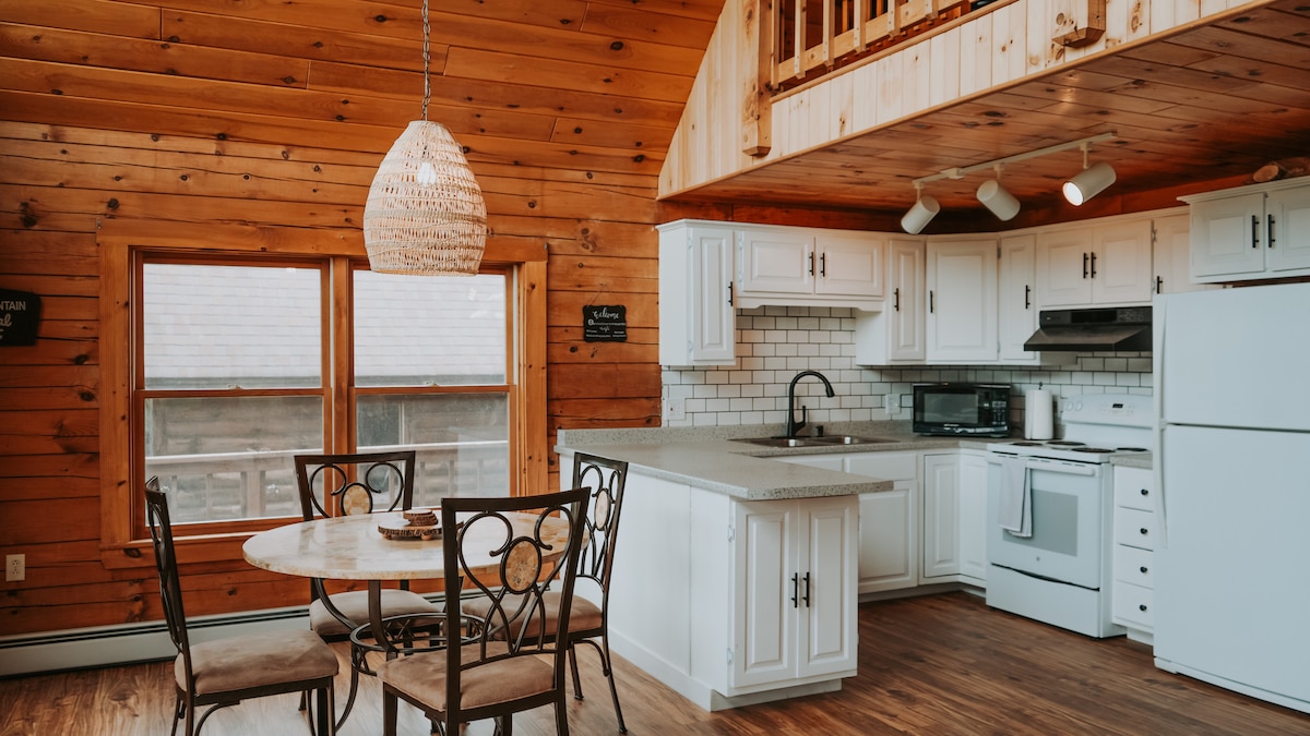 Welcome to our Cozy Mountain View A-frame Log Cabin! This chalet has grand windows overlooking beautiful mountains and features 2 bedrooms, a loft with a futon, 2 full baths, newly renovated kitchen, high-end furnishings, appliances, Roku smart TV, Wi-Fi, wrap around deck, and screened in porch. Less than 1 minute from Santa's Village, access to snowmobile trails from the house, close to popular ski resorts and lots of hiking including NH's 4000 footers. The perfect place to unwind and getaway.
