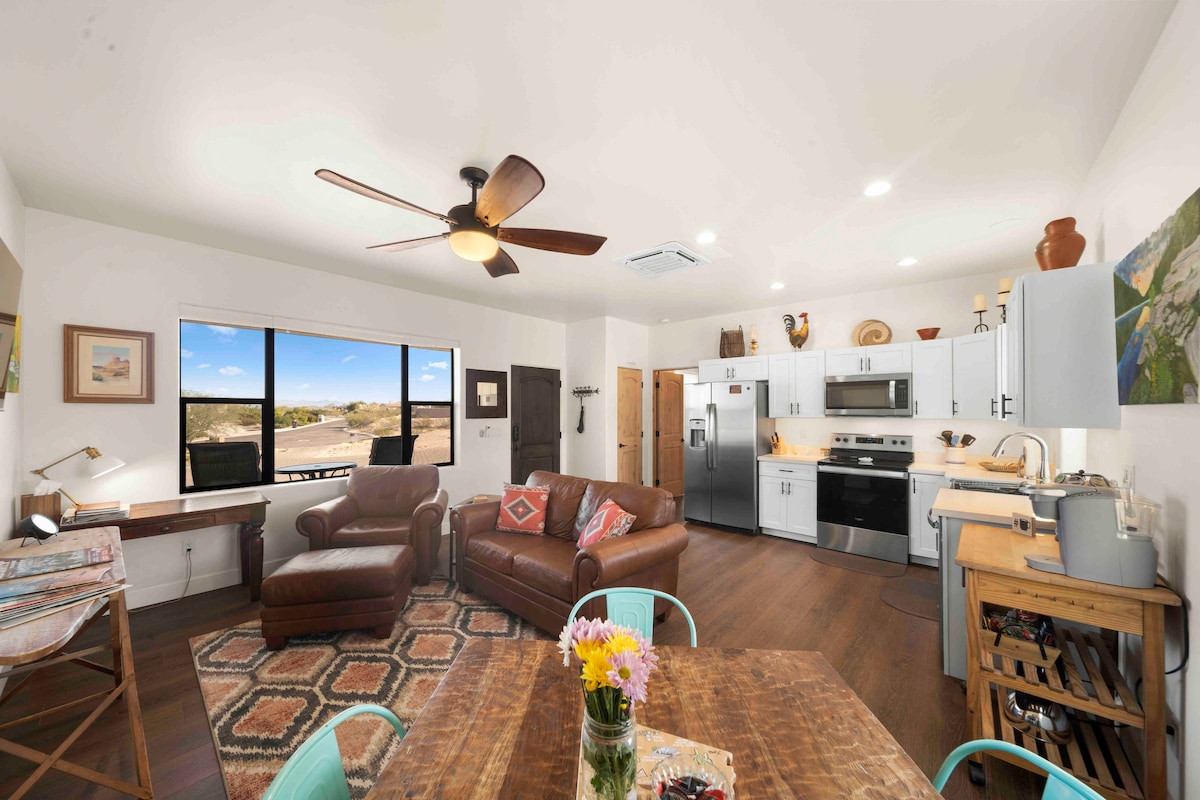 Guest House with a private entrance and yard with a relaxing view. Secluded neighborhood near Rancho Rio, Simpson Ranch and Downtown Roping Arenas. Plenty of space for parking and horse trailers. Trails are located right nearby and minutes from Downtown Wickenburg. The only stairs are on the outside leading to the guest home. There is a couch in the living room and if needed we allow for one extra guest at $25.00 per night.