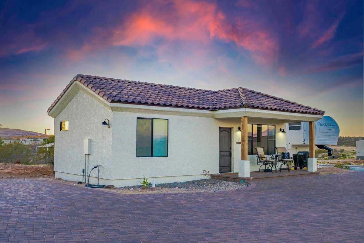 Horses Welcome! Experience tiny home living in this adorable desert getaway. Separate from main house w/plenty of parking to accommodate large rigs. Queen size bed. Kitchen complete w/everything needed for cooking. 2 outside patios. BBQ, fire pit & chairs. Located 10 miles from Wickenburg. Hooves & Horns & Dillions Western Trails arenas are 3 miles. 22 x 22 covered horse pens available at an additional charge of $10.00 per night per pen. 5 pens, turnout, 60x60 arena. No cattle. No dogs or cats.