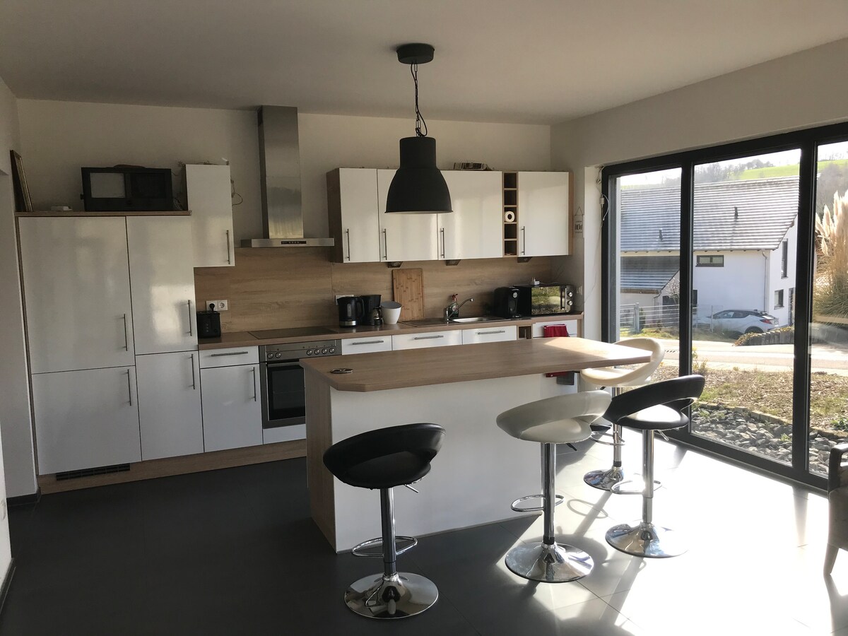 The EyerHof - owned by the Eyer family for three generations - a farmhouse over 120 years old that was completely renovated from 2019 - 2022 and now combines the special charm of a farmhouse with modern industrial style. Obok tarasu, podwórka i ogrodu znajduje się stacja grillowa z dużym nowym grillem gazowym Rösle i stodołą, która może służyć jako przytulny salon. Wnętrze domu łączy elementy muru pruskiego z nowoczesnymi ścianami z żelaza, drewna, piaskowca, gliny, a także stare z nowym 🖤