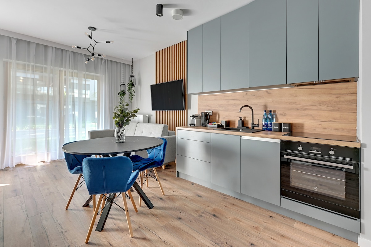 Nowoczesne mieszkanie o wysokim standardzie, idealne dla par (maksymalnie 2 osoby). Blisko centrum, z bardzo dobrą komunikacją – w bezpośrednim sąsiedztwie znajdują się przystanki autobusowe i tramwajowe. Mieszkanie znajduje się w budynku z lat 70-tych, położonym w spokojnej dzielnicy mieszkaniowej, w odległości około 1,5 km spacerem od Starego Miasta. Lokal usytuowany jest na drugim piętrze budynku wyposażonego w windę. W okolicy dostępnych jest wiele bezpłatnych miejsc parkingowych.