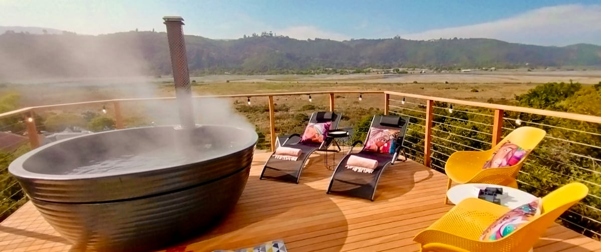The Tuffet is an elegant studio ideal for couples seeking a romantic oasis in the beauty of the Garden Route. With a private wood-fired hot tub overlooking idyllic views of the lake and mountains, this stylish, secluded space has all the simple luxuries needed to rest in nature. Pet-friendly and off the grid with air con, Wi-Fi, TV, Amazon Prime and all the essentials. Relax and reconnect with each other. Enjoy our farm trails, shared pool with stunning views, and the neighbouring national park.