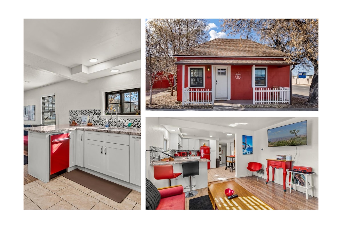 Ciesz się naszym wyjątkowym Burgundy Bungalow z dwiema sypialniami i dwiema łazienkami, dwa drzwi od zabytkowej trasy 66 w centrum Williams. Łatwy dostęp do tras rowerowych i pieszych. Spacer do Grand Canyon Railroad, Canyon Coaster Adventure Park i Route 66 Zipline. To świetna baza wypadowa na wycieczki do Wielkiego Kanionu, Flagstaff, Sedony i Snowbowl. Szybkie Wi-Fi, telewizory SmartTV w salonie i sypialniach, krzesła Adirondack, palenisko, grill, w pełni ogrodzony podwórko. Pralka/suszarka, parking na miejscu. W pełni odnowiony z nową centralną klimatyzacją i ogrzewaniem.