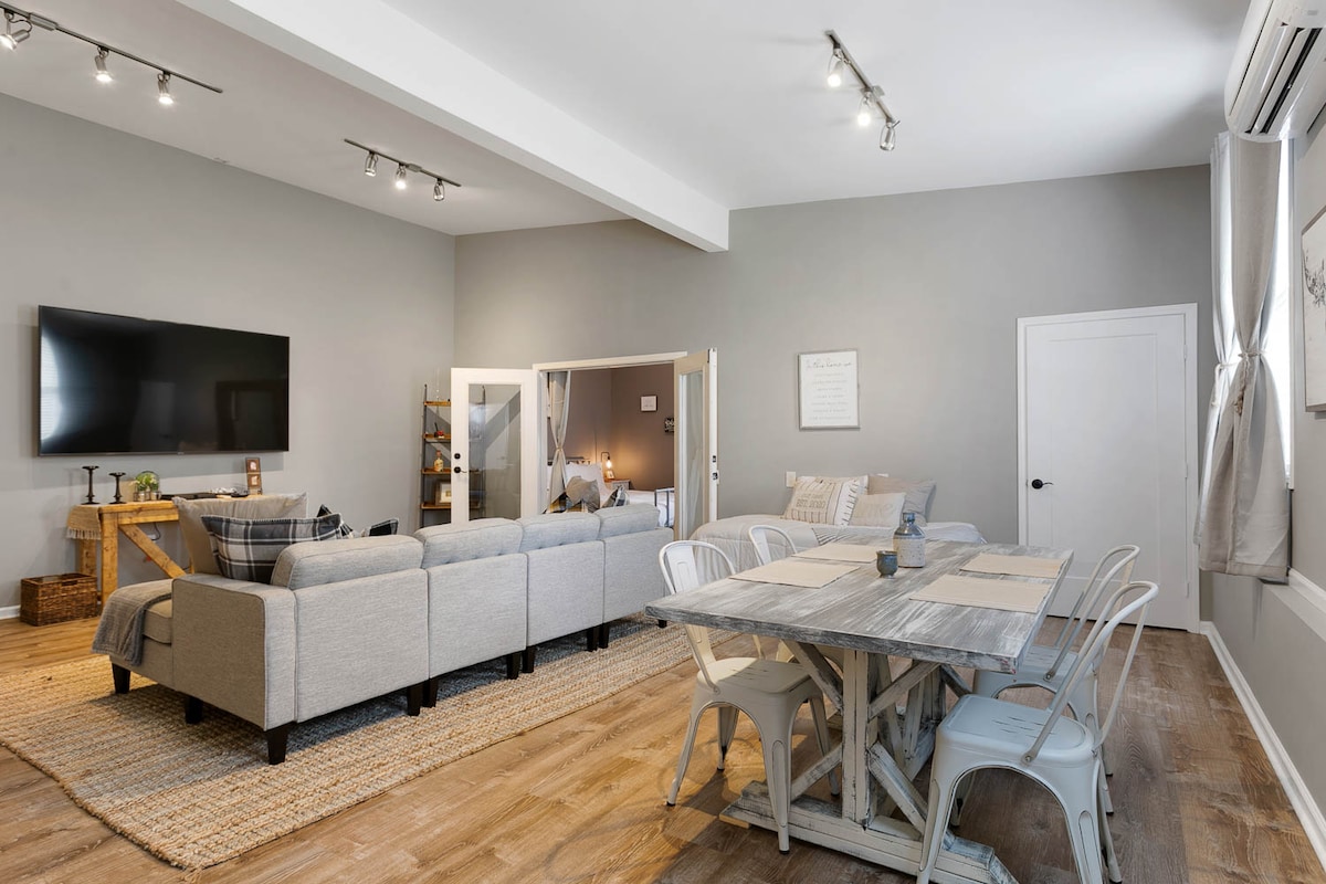 Luksusowy apartament w zabytkowym centrum Franklin, półtora przecznicy od Main St. Wysokiej klasy wykończenie i profesjonalnie urządzone. Idealne dla par lub rodzin z małymi dziećmi. W pobliżu znajdziesz wiele restauracji, kawiarni, barów, sklepów i wszystkie festiwale organizowane w Franklin, w tym Pilgrimage. Na dole znajduje się rozkładana sofa, aneks kuchenny, bar z jadalnią i telewizor. Na górze znajduje się łóżko typu queen, pełna łazienka i telewizor. Aneks kuchenny posiada zlewozmywak, lodówkę/zamrażarkę. Prywatny parking i wejście.