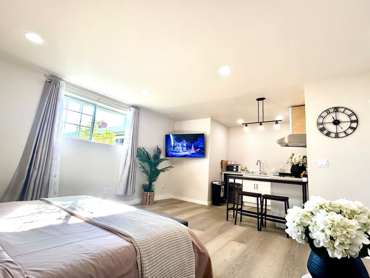 Nasz wolnostojący pensjonat położony jest w centrum DTSJ w pobliżu Japantown, oferuje wyjątkowo wygodne łóżko typu king-size i klimatyzację typu mini split w sypialni, która gwarantując spokojny sen. W pełni wyposażona kuchnia dla szefów kuchni i dla tych, którzy muszą pracować podczas pobytu, automatyczne ergonomiczne biurko do pracy w pozycji siedzącej. Oaza na świeżym powietrzu obejmuje ogromny 65-calowy telewizor Smart TV, oświetlenie nastrojowe, zewnętrzny wentylator sufitowy, kominek na propan oraz jadalnię i salon. Parkowanie na ulicy jest bezpłatne i obszernie.