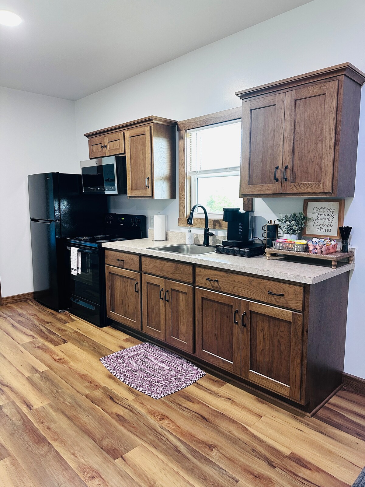 Black Rock Cabin is a historic Log Cabin that has been Completely Renovated. Featuring an open Main floor with living, dining and kitchen space. Upstairs is a full bedroom and bathroom. Experience the tile shower with its gentle rain head, then relax beside a crackling wood fire in the living room. Enjoy the corner kitchen with a stove, oven, fridge, microwave, and coffee maker. Sit at the rustic dining table or pull out bar stools at the counter.
