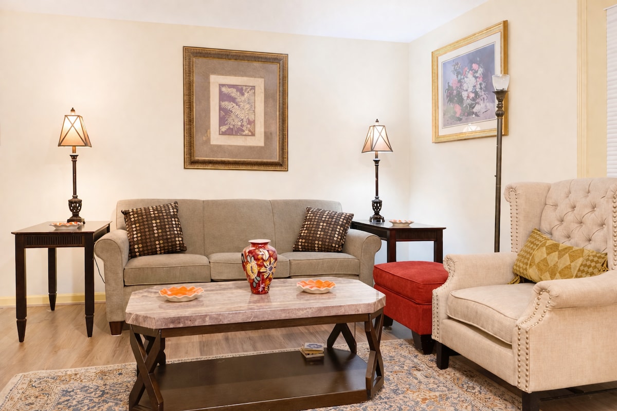 Urocze mieszkanie jest blisko wszystkiego! Spacer do sklepów, muzeów, restauracji, kawiarni, barów, Tanger Center, skleku spożywczego, parków miejskich i wielu innych miejsc. Również w odległości spaceru od UNC Greensboro, NC A&T i Elon Law. 65-calowy telewizor Smart TV w salonie. Wszystkie udogodnienia, w tym pralka, suszarka, zmywarka i kuchenka mikrofalowa. Kawa, herbaty, filtrowana woda i przekąski. Pościel, ręczniki i pościel. Niezależnie od tego, czy lubisz życie nocne, spacery po parku, czy próbujesz nowych restauracji, centrum Greensboro ma wszystko!