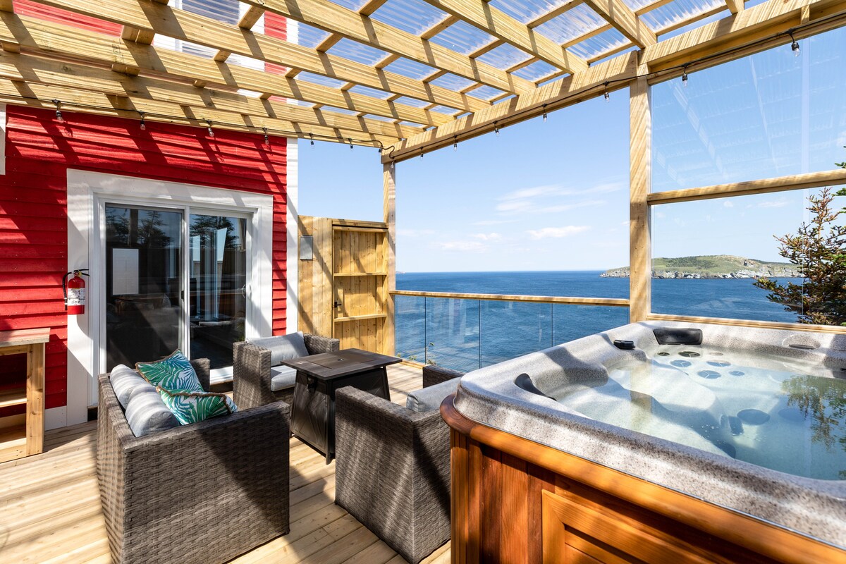 Located in Bay Roberts this secluded coastal cottage is a new build that offers rustic charm with a modern twist along with a beautiful ocean view. It has 2 bedrooms, 1 bathroom, 2 communal areas, and a well equipped kitchen. It also has TV/Internet and a mini split. Outside you can enjoy the comfort of a six- person hot tub, a koi pond, and berry picking in the summer and fall. The covered patio allows for all season use. Ideal for families and friends getting together.