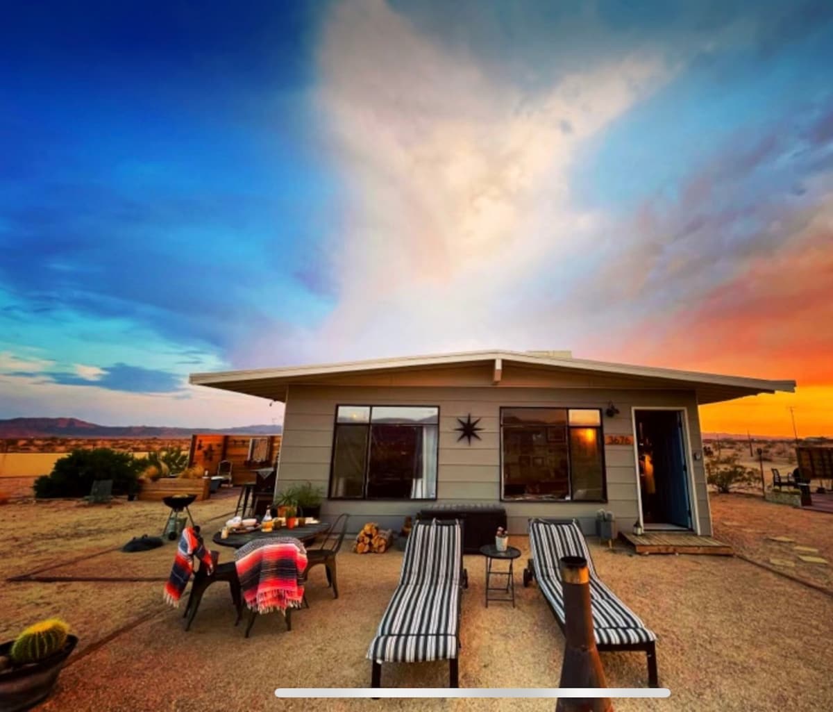 * Tylko 20 minut od północnego wejścia do JTNP! Idealne miejsce dla obserwatorów gwiazd i marzycieli, ucieczka od hałasu/chaosu miasta. Nie do końca „poza siecią”, ale nasza chatka jest świetnym miejscem na relaks. Idealne na romantyczne weekendy lub dla osób, które szukają kreatywnej przestrzeni. Mały, ale funkcjonalny aneks kuchenny, mini-lodówka, klimatyzacja i grzejnik elektryczny; łóżko typu Queen, dodatkowe łóżko to rozkładana sofa. Basen dla kowbojów, palenisko, hamaki. Niesamowite widoki na wschodzące i zachodzące słońce na pustyni. Przyjdź do Joshua Tree i ciesz się tym klejnotem chatki