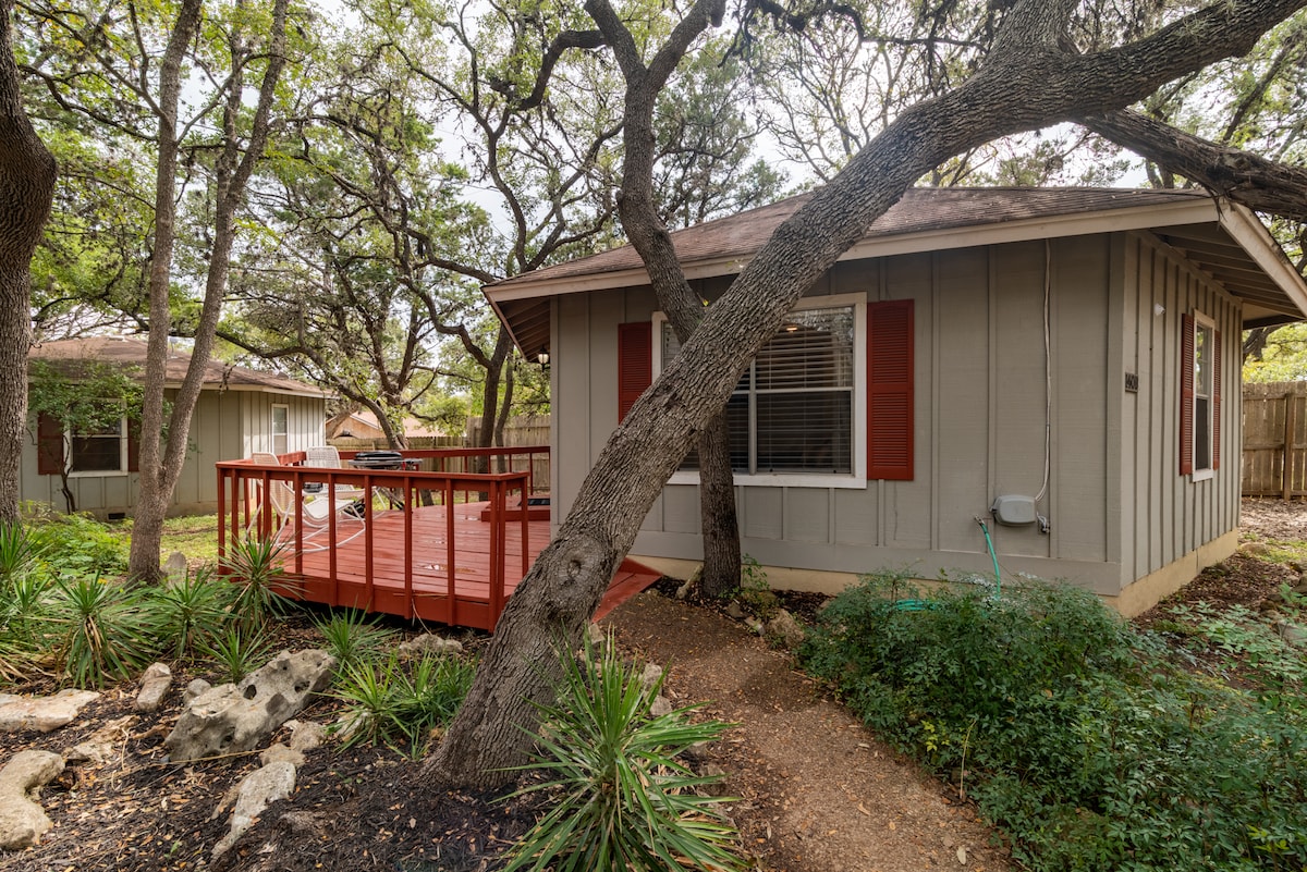 Just steps from the heart of Wimberley, Lone Star Bungalow is a quiet Hill Country retreat with extra space and privacy—while still being walkable to town. Ideal for families, couples, or friends, this 2-bedroom hexagon bungalow feels easy and comfortable, with a cozy living room, full kitchen, and small dining area for slow mornings or shared meals. Step out to the private patio—often visited by local deer—then wander into town for shops, dining, live music, or a refreshing swim at Blue Hole.