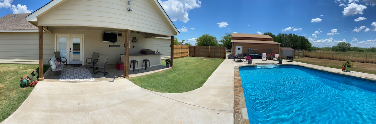 Forget your worries in this spacious, private, and serene space. Located on 400 acres in West Texas the Raymond Ranch is the perfect getaway to reconnect with loved ones and disconnect from the daily grind. Our place has two private bedrooms, a loft that sleeps 8, 2 bathrooms, a spacious kitchen/dining/living area, and a kids play area. Relax on the patio or porch overlooking the pond with gorgeous sunsets and sunrises and also a firepit for the bright stars at night. Come and stay!