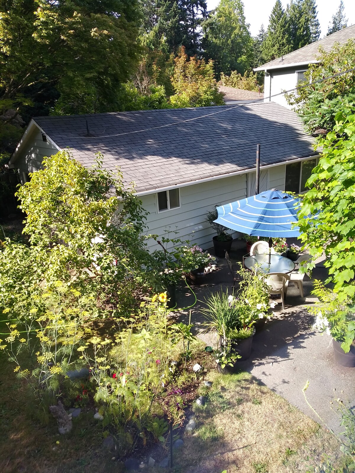Ten przytulny domek Pacific Northwest o powierzchni 650 stóp kwadratowych znajduje się w ogrodzie z dala od ulicy. Shade & sun. To kompletny dom. Eklektyczny wystrój obejmuje zabytkową łazienkę, wannę z łapką z opcjonalnym prysznicem, otwartą kuchnię, w której można gotować, kącik kawowy i jadalnię, pełny salon, sypialnię, szafy itp. Prywatny dojazd i parking. Autobus zatrzymuje się z przodu. W okolicy jest wiele drzew, widoki na ośnieżone góry, krótkie przejażdżki na plaże, międzynarodowe restauracje. 12 mil do Seattle.