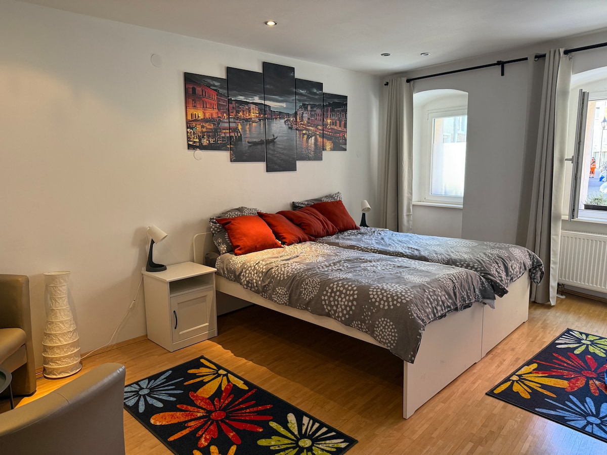 Witamy w pięknie urządzonym 2-pokojowym mieszkaniu w samym sercu Ulm, zaledwie kilka kroków od Katedry w Ulm. Czeka na Ciebie jasny salon ze SmartTV, sypialnia z łóżeczkiem dziecięcym, kącik zabaw, piękna loggia, w pełni wyposażona kuchnia i nowoczesna łazienka. Wi-Fi, pralka i przekąski zapewniają komfort. W pobliżu znajduje się wiele restauracji, sklepów i parkingów – idealne na wakacje lub podróż służbową. Czekamy na Ciebie!😊