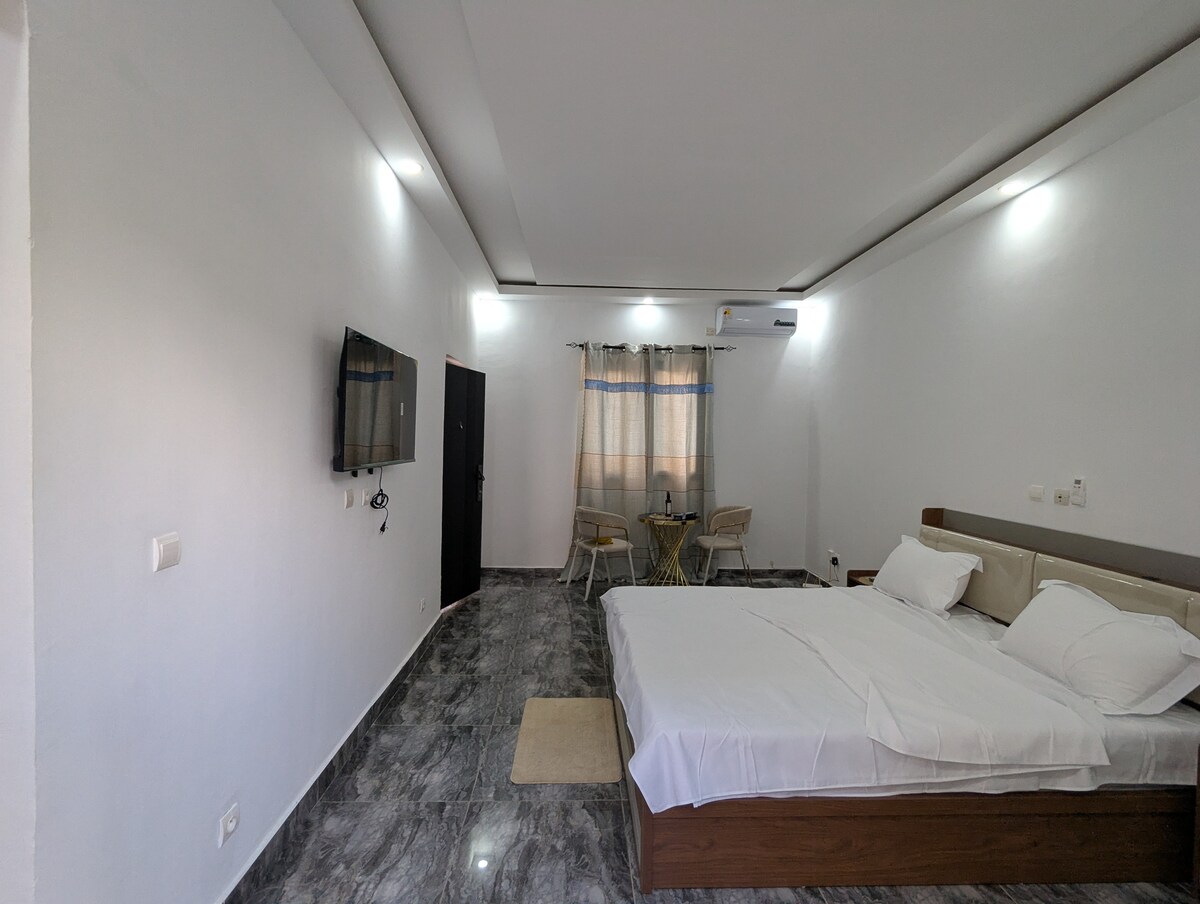 Seul, en famille ou entre amis, NE CHERCHEZ PLUS. Nous mettons à votre disposition une Résidence Meublée dénommée PREMIUM (2 Pièces) au sein d'une mini cité (LES RÉSIDENCES HARMONIE 5G) 𝐜𝐥ô𝐭𝐮𝐫é𝐞 𝐞𝐭 𝐬é𝐜𝐮𝐫𝐢𝐬é𝐞 avec +20 places de parking gardé au quartier Résidentiel Ambassade, situé à 3 minutes du Stade Charles Konan Banny. Accès facile. Cuisine entièrement équipée (Micro-ondes & Mixeur) - Gazinière 4 Feux et Four - Réfrigérateur - Chauffe-eau- TV (Canal)