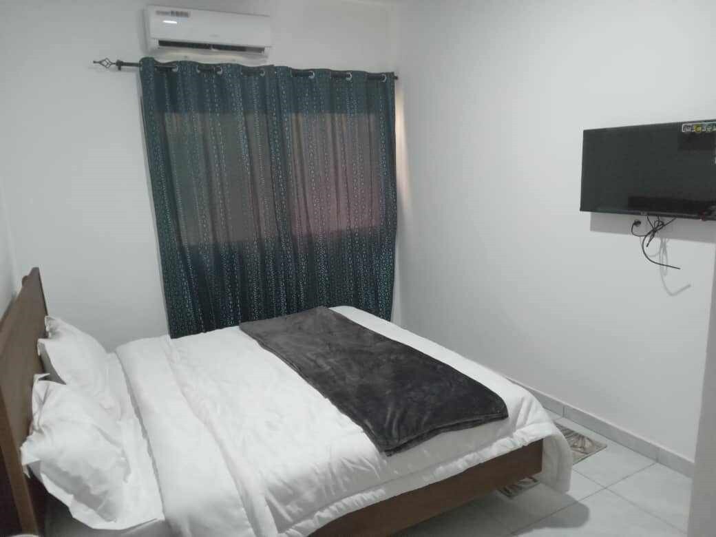 Apartament w Yamoussoukro 300 metrów od stadionu. Ciche i bezpieczne miejsce. Ciesz się balkonem. Klimatyzowane pokoje. Canal + i WIFI Mikrofalówka, lodówka, czajnik, podgrzewacz wody pod prysznic.