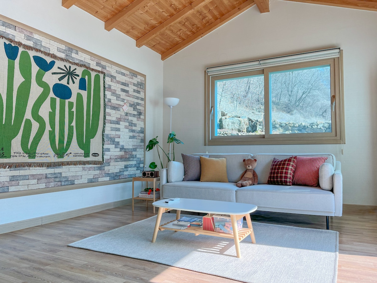 Young-Wall's Stayhouse to prywatne miejsce dla par, które chcą się zrelaksować. To budynek dwupoziomowy, więc na górze możesz odpocząć w przytulnych, przytulnych pokojach, które są również prywatnymi przestrzeniami. Szum wody w dolinie, ćwierkające ptaki i świeże powietrze z okna dają odpoczynek znużonemu sercu miasta, a pościel, która jest codziennie utrzymywana w czystości, zapewnia wygodny sen. Znajduje się blisko Oseibobeon-gil w Kim Satgat Valley, a piękna dolina przepływa tuż przed domkiem. Dzięki głośnikom Marshall w pokoju możesz cieszyć się bardziej autentyczną muzyką i wygodnym filmem dzięki projektorowi LG w trybie gotowości, a także spędzić trochę czasu na ładowaniu baterii na łonie natury w hamaku pięknego ogrodu o zachodzie słońca! + Pojemność rezerwacji: 2 osoby dorosłe (Yeongwol Stayhouse działa jako strefa bez dzieci).