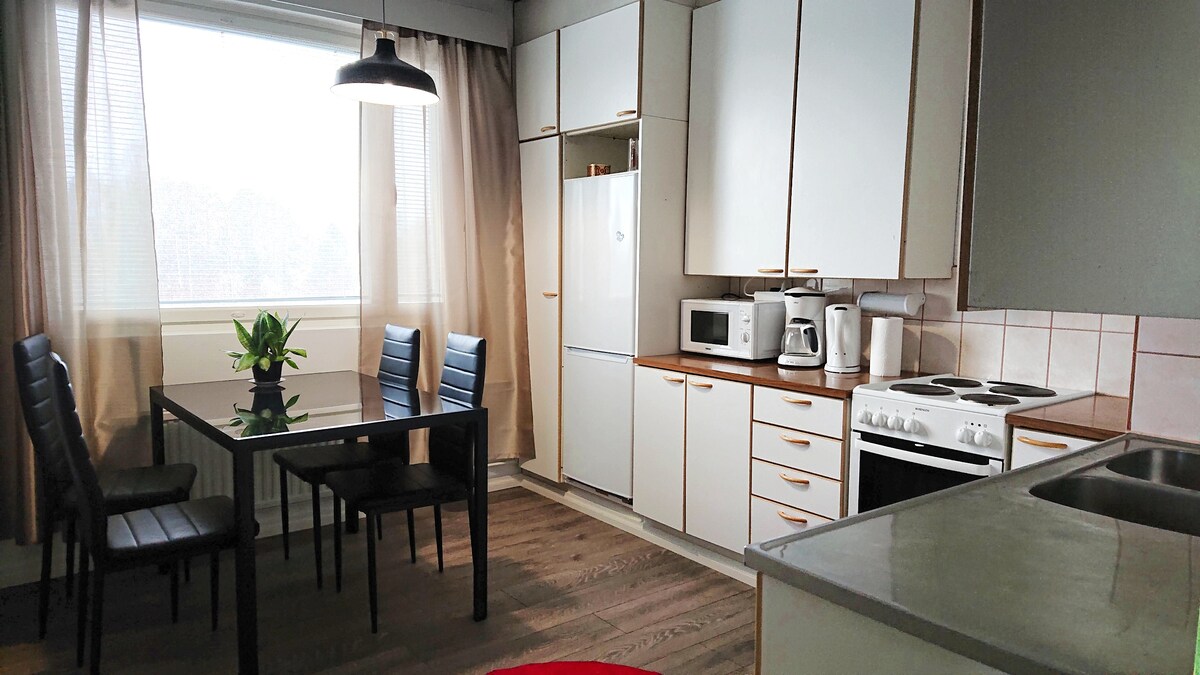 Täysin varusteltu, viihtyisä ja tilava kt-kaksio keskustan lähellä. * Wifi * Lasitettu parveke * Rauhallinen taloyhtiö * Maksuton autopaikka * Hyvät kuntoilumahdollisuudet lähellä * Ruokakauppaan 2min kävelymatka * Kaksi lounasravintolaa naapurustossa * Uimahalliin 800m