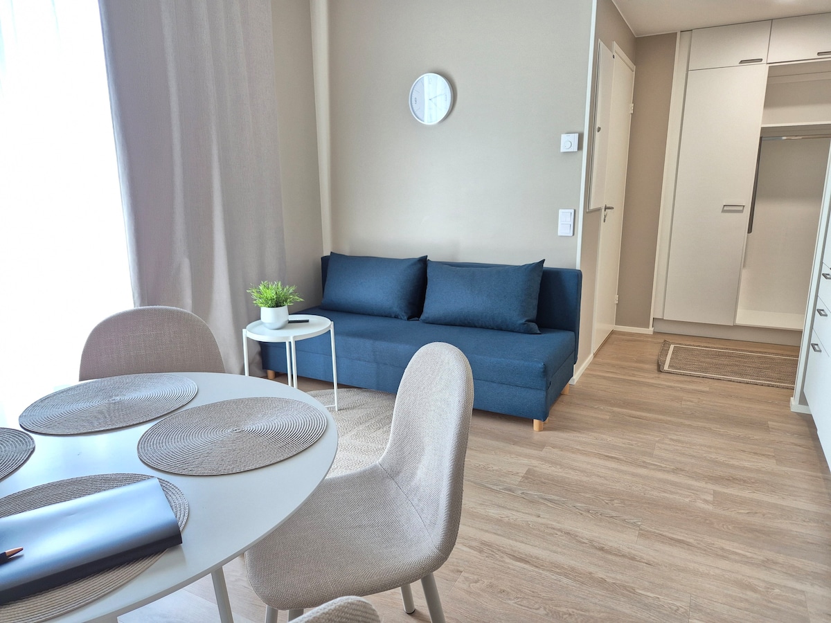 Przytulny i dobrze wyposażony apartament typu studio na drugim piętrze kondominium. Apartament posiada podwójne łóżko i rozkładaną sofę (2+2 osoby), salon/jadalnię i przeszklony balkon. Powierzchnia użytkowa apartamentu wynosi około 30 m2. Apartament posiada łazienkę/WC i dodatkowo w soboty dostępny jest do sauny firmy mieszkaniowej. Wyposażenie: zmywarka, naczynia, lodówka, ekspres do kawy, toster, suszarka do włosów, żelazko i deska do prasowania, pralka, kuchenka/piekarnik, kuchenka mikrofalowa, TV, odkurzacz i pościel dla 4 osób, bez pościeli.