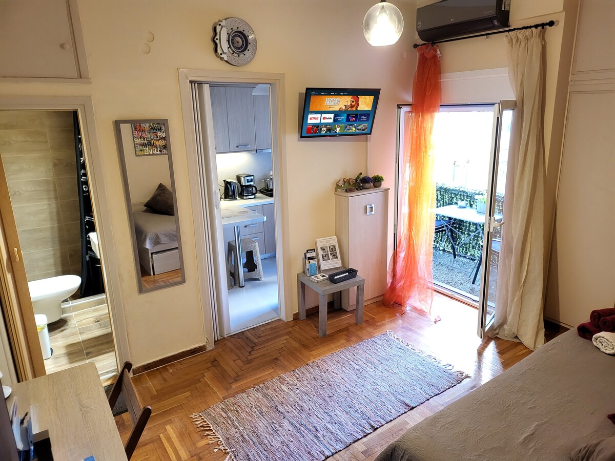 Obok centrum Aten, w dzielnicy Caravel, znajduje się to małe, przytulne mieszkanie o powierzchni 25 metrów kwadratowych. Miejsce składa się tylko z jednego pokoju, kuchni, małej łazienki, małego holu i cichego, małego, ozdobnego balkonu na 5 piętrze z bardzo cichymi podwórkami budynków na parterze z drzewami i roślinami wokół. Bardzo relaksujące dla pary i pojedynczej osoby, która musi pracować przy biurku w sypialni lub przy stole na balkonie. Jest to bardzo turystyczna strefa i trasa do Akropolu oddalona o 2 km.