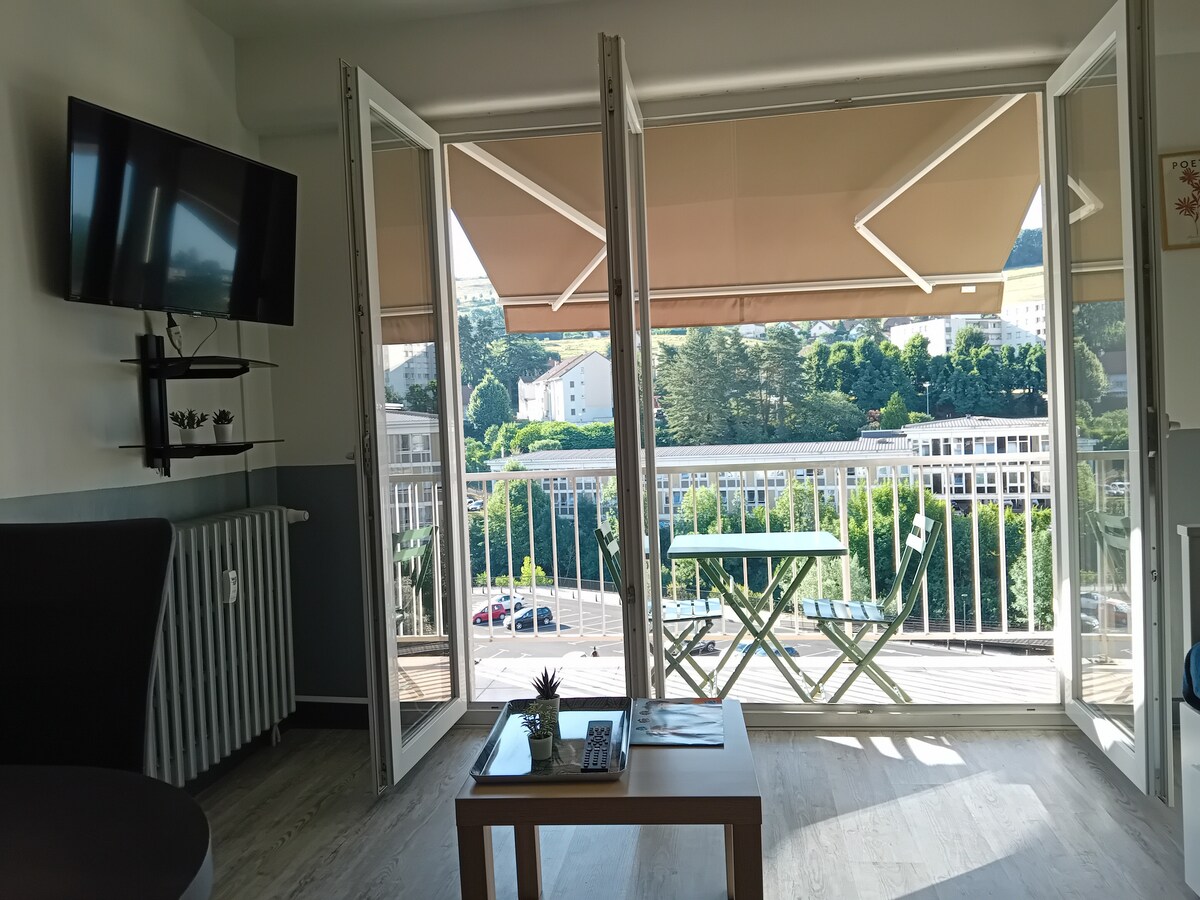Situé centre ville à 2 pas du square dans une arrière cour au 1er étage avec petite terrasse découvrez ce joli studio entièrement rénové Le logement équipé tout à neuf Cuisine (frigo, plaque de cuisson, micro-ondes, cafetière, grille pain, vaisselle, bouilloire) Lit (140) Tv Wi fi Salle de bain sèche-cheveux Draps et serviettes fournis parking gratuit (foirail 5mn) payant (gravier 2mn) à pied ATTENTION - arrivées des dimanches après 17h - animaux interdits